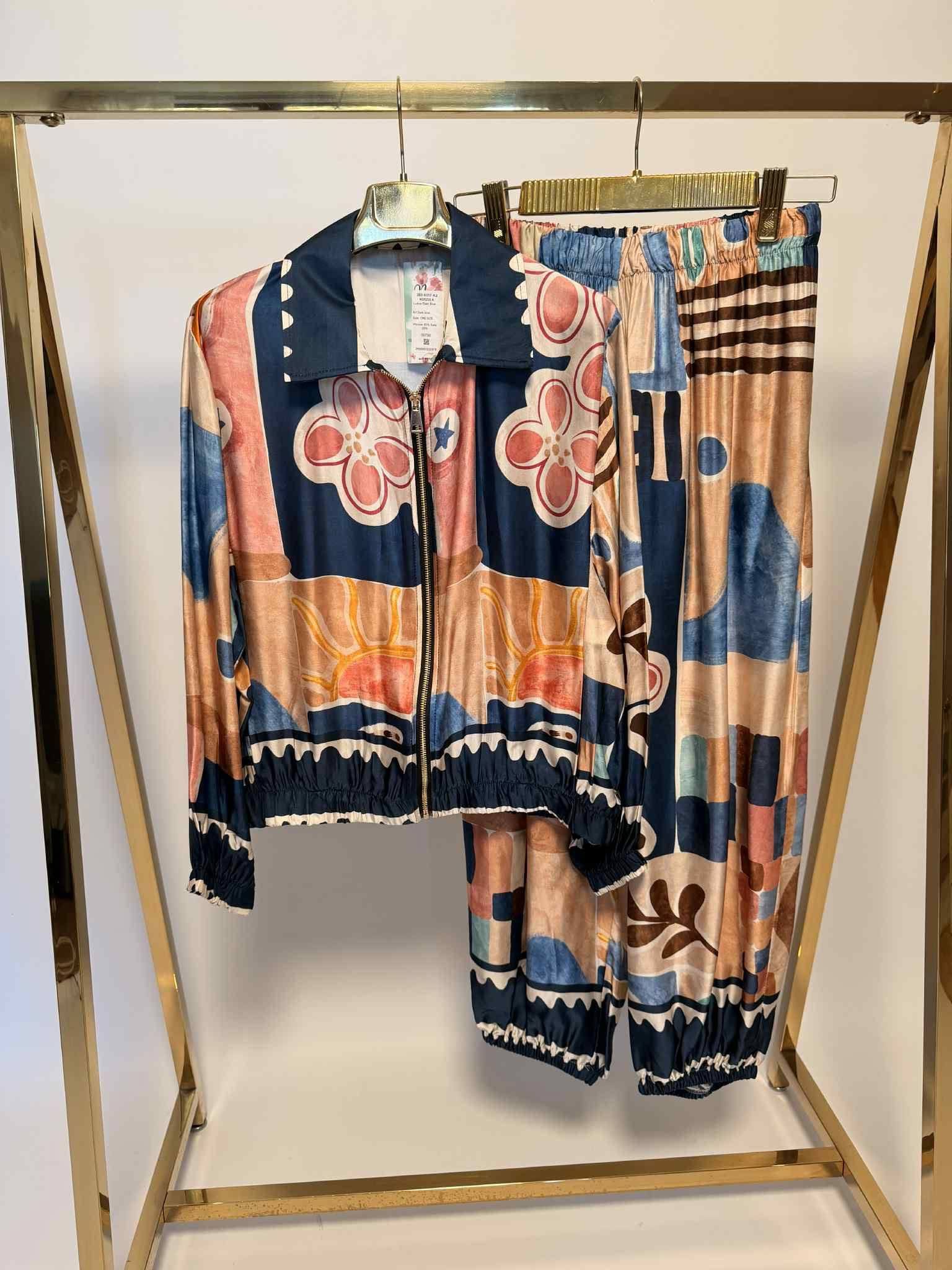 Drogie Panie, do sprzedania przepiękny komplet z najnowszej, włoskiej kolekcji wiosennej. Nowy, z metką. Skład: 80% wiskoza, 20% jedwab. Lekki, miły dla ciała. Lejący. Bluza zapisana na suwak. Ściągacze na dole spodni. Cudne, żywe odcienie.
