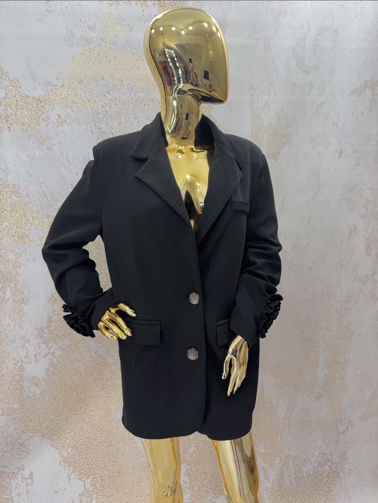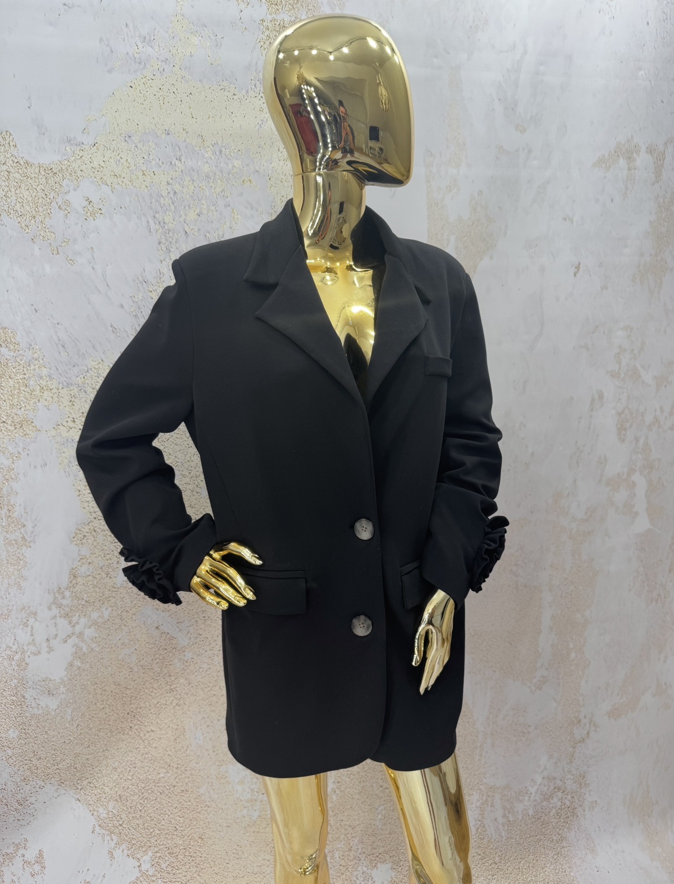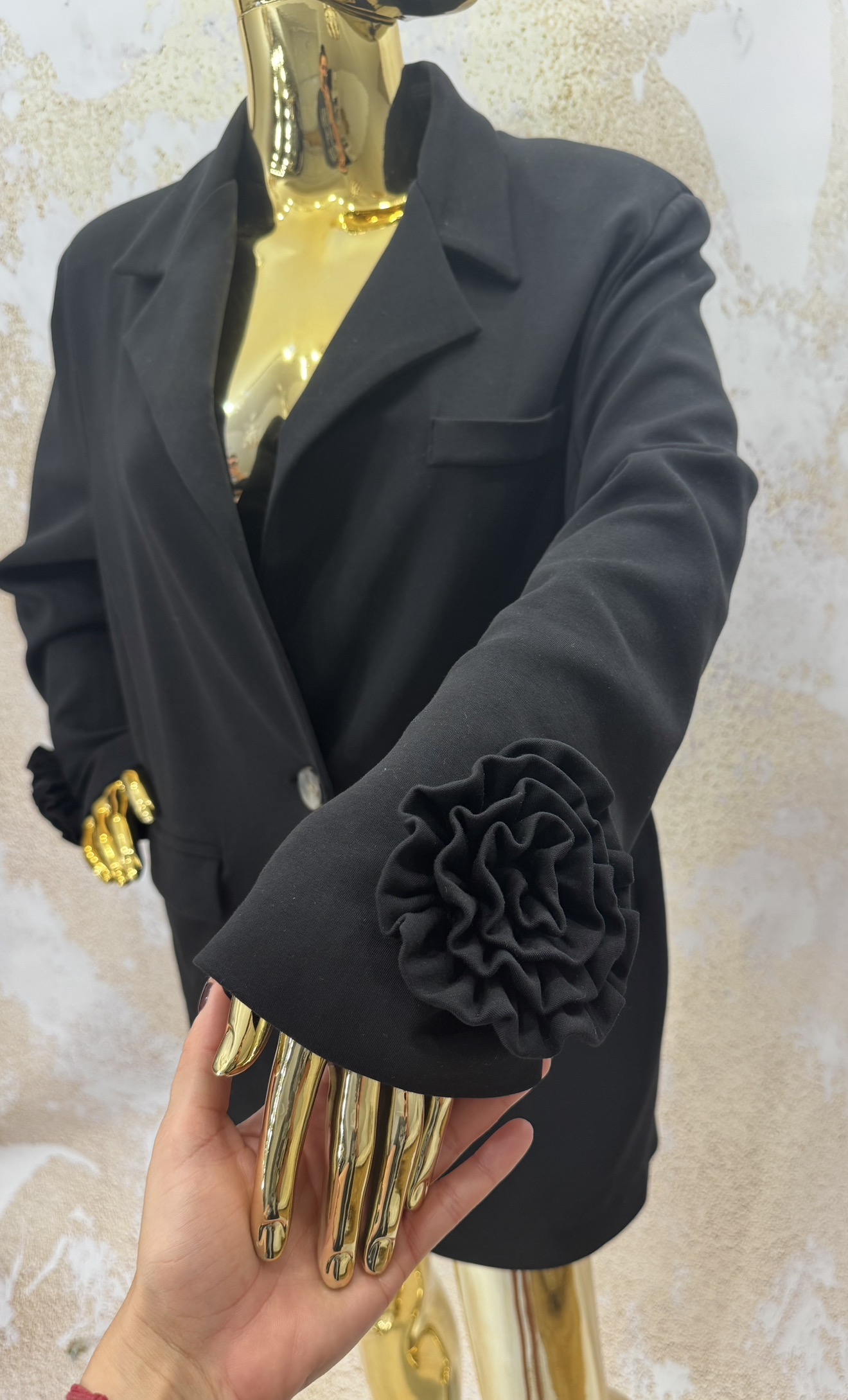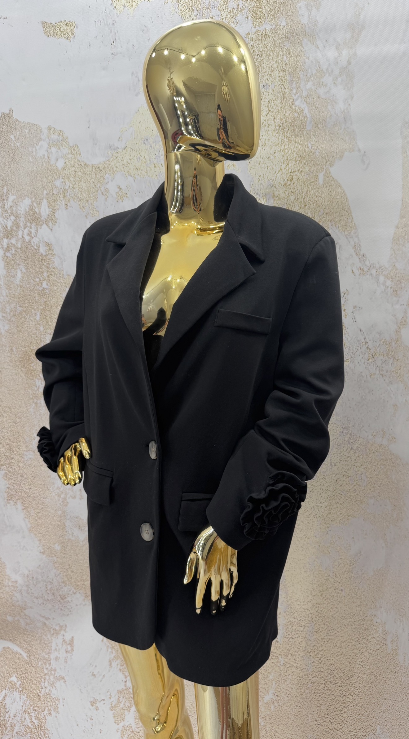 Drogie Panie, do sprzedania marynarka polskiej marki Cocomore. Nowa. Czarna. Modne róże przy rękawach. Skład: 77% rayan, 14% nylon, 9% elastan. Na podszewce. Bardzo miły materiał. Fason oversize.